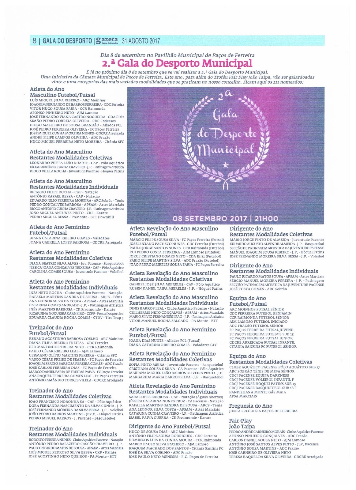 Vai realizar-se na próxima sexta feira dia 8 de setembro pelas 21 horas no Pavilhão Municipal a 2ª Gala Municipal do Desporto.
